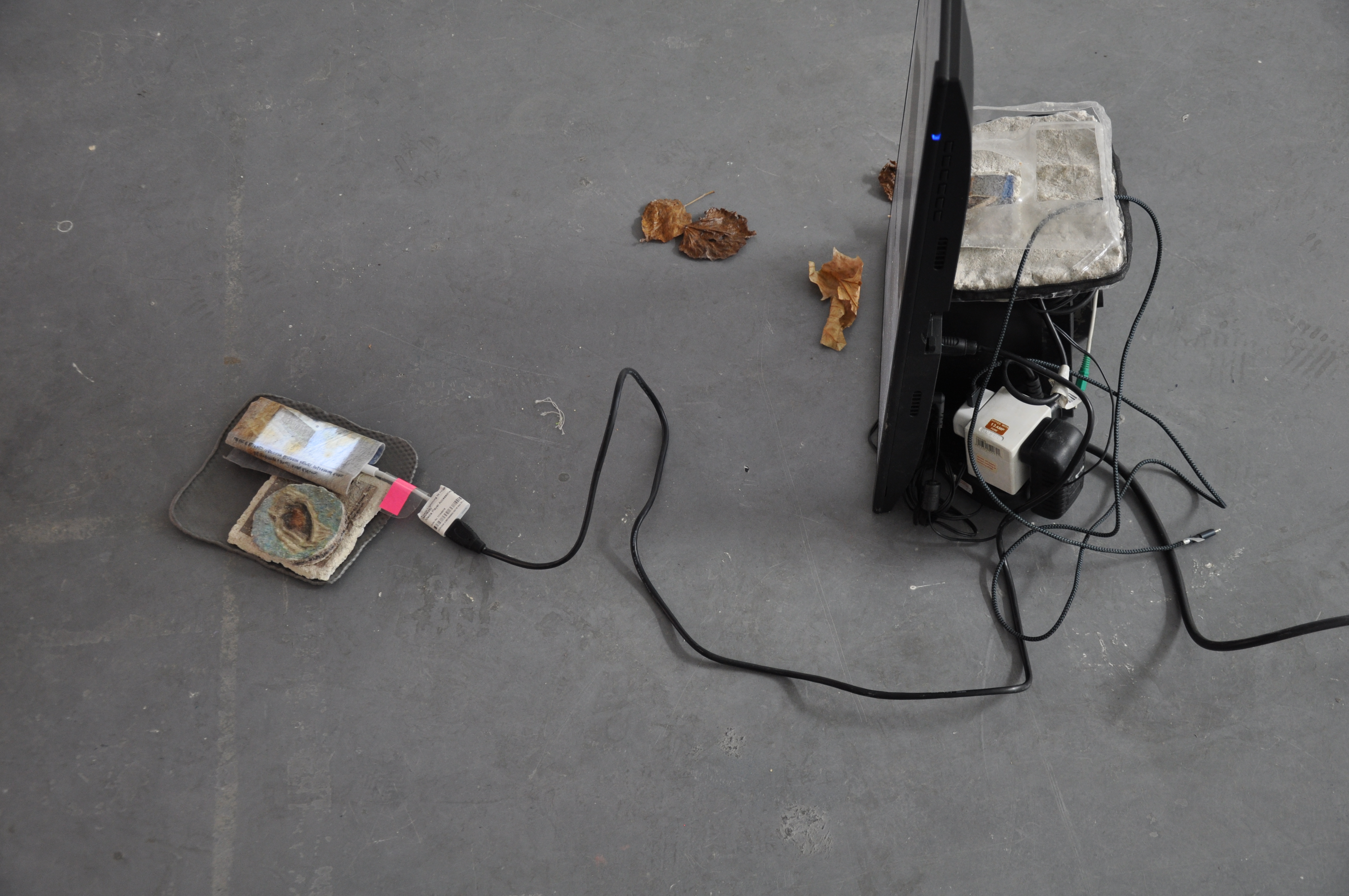 LCD monitor, video (08:42 min, looped), stereo sound, leaves, plastic, paper
